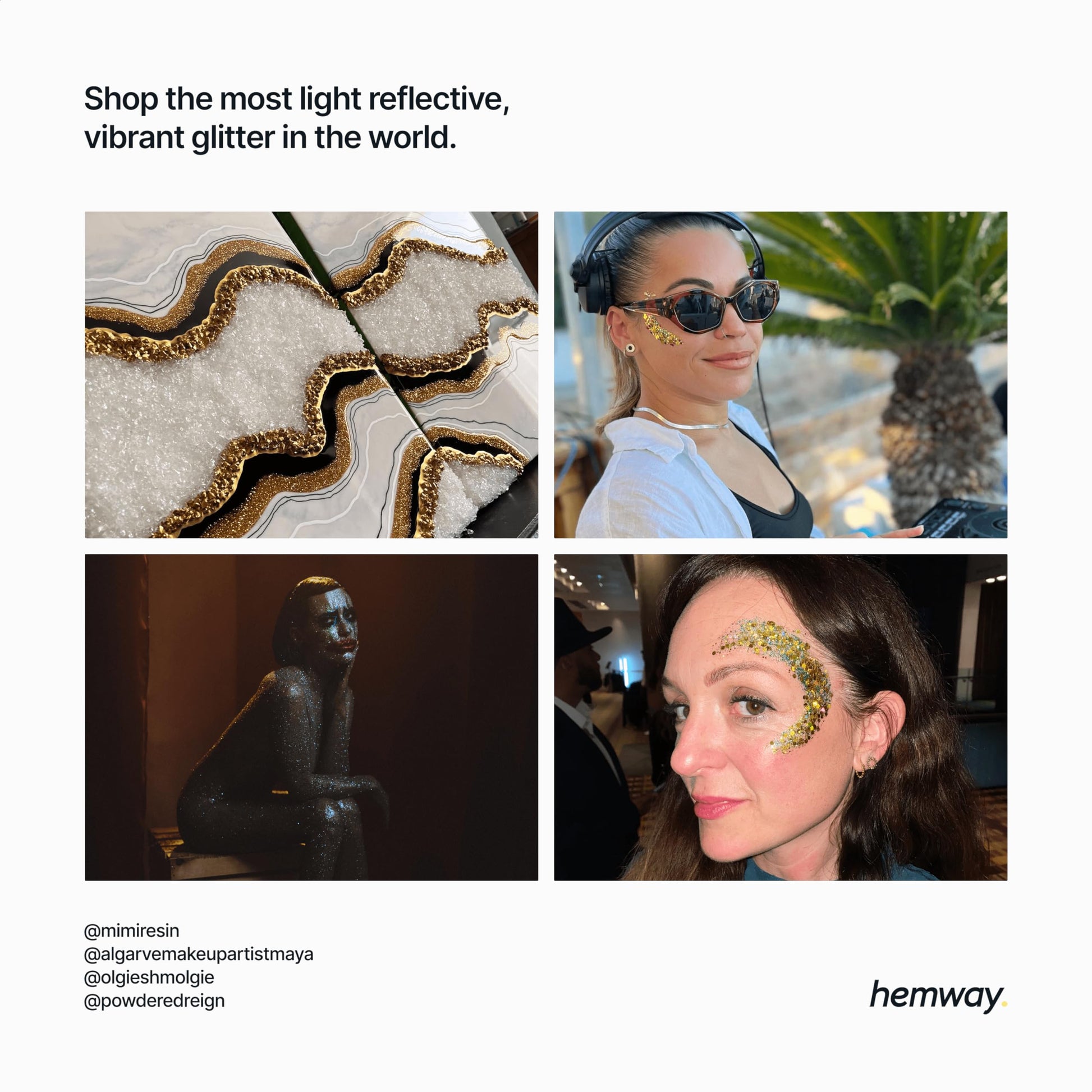 - ★ No.1 Trade Multi-Purpose Premium Glitter ★ Hemway Premium Unique Multi-Purpose Glitter is specifically designed, quality (Grade A) for the use with Glass, Art, Nail, Floristry, Body Art, On skin usage, Hair, Face, Nails, Makeup, Flowers, Beards, Cards & much more